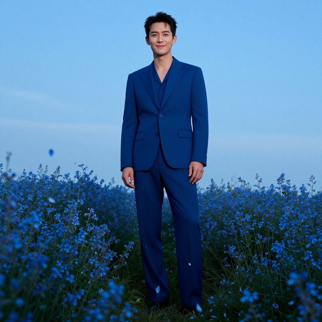 A man dressed in a sharp blue suit stands confidently in the middle of a vibrant blue flower field under a clear sky. The harmonious blend of his outfit with the floral surroundings creates a visually striking and serene composition.