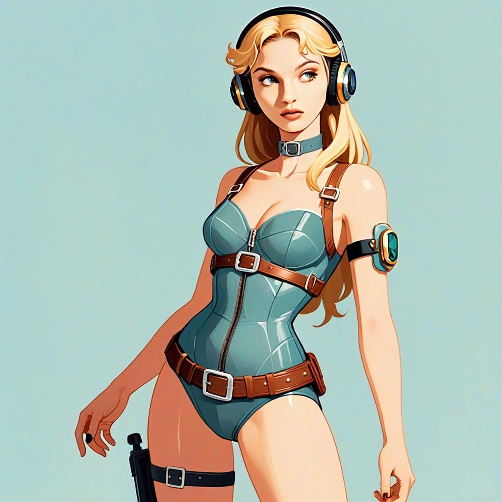 This digital artwork depicts a confident young woman wearing a teal, futuristic bodysuit accented with brown leather straps and metallic buckles. She sports large headphones and an arm device, embodying a modern, sci-fi style with a sleek, polished finish reminiscent of contemporary anime illustration.