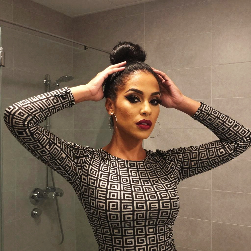 A confident woman poses in a modern tiled bathroom while adjusting her sleek top bun hairstyle. She is wearing a fitted, long-sleeve dress featuring a bold black and white geometric pattern, complemented by striking makeup and large hoop earrings.