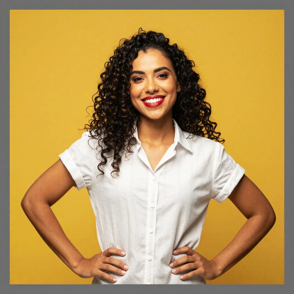 A confident young woman with curly dark hair smiles brightly against a solid yellow background. She wears a casual white short-sleeve button-up shirt and poses with her hands on her hips, exuding a positive and approachable energy in a clean, modern portrait style.