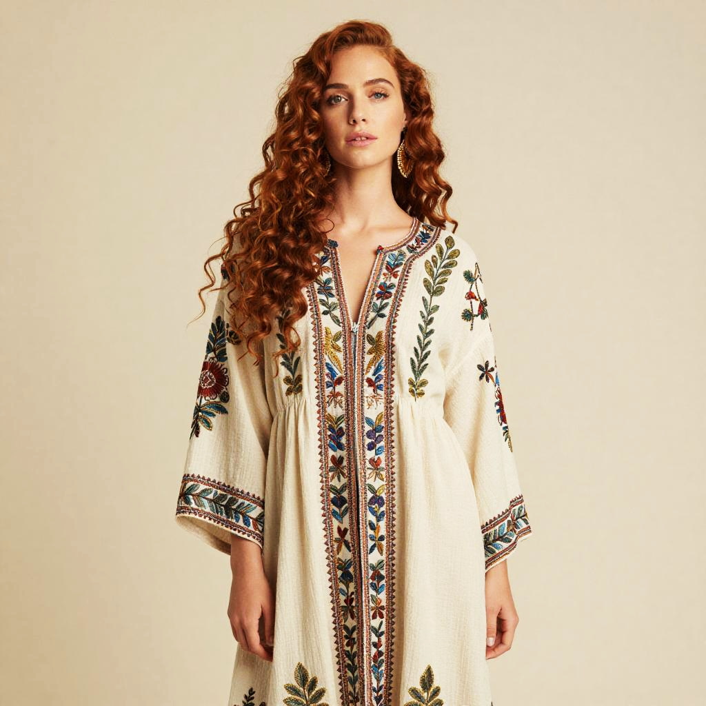 Bohemian Embroidered Dress Worn by Woman with Curly Red Hair