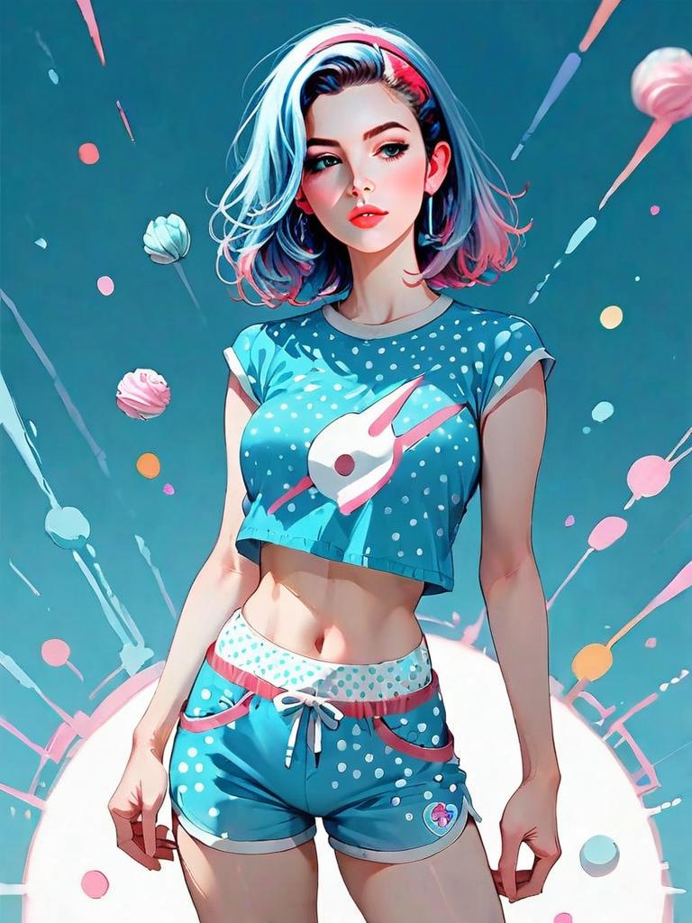 A digitally illustrated young woman with short, colorful hair sports a vibrant cobalt blue cotton bralette and matching sporty shorts adorned with white polka dots and pink accents. The style blends modern anime aesthetics with a touch of retro pop art, set against an energetic and abstract background with dynamic shapes.