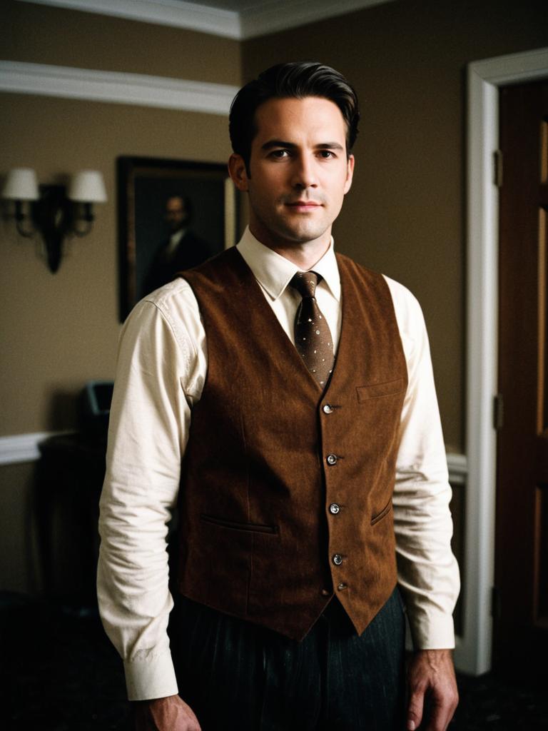 A man is standing in a room wearing a brown suede vest over a cream-colored dress shirt, complemented by a brown polka dot tie. The setting appears classic or vintage inspired, with warm lighting and traditional decor in the background, highlighting a timeless, refined style.