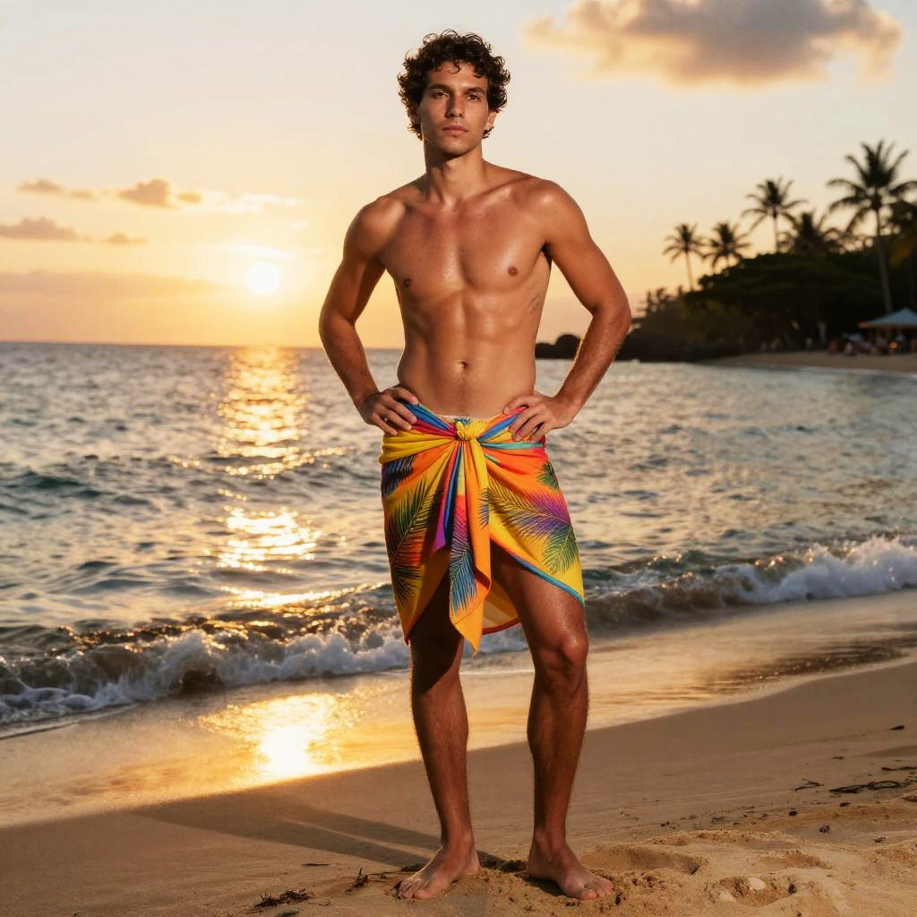A young man stands confidently on the beach during sunset, wearing a vibrant, tropical-patterned sarong. The warm golden light reflects off the water, highlighting his relaxed pose and the serene coastal backdrop.
