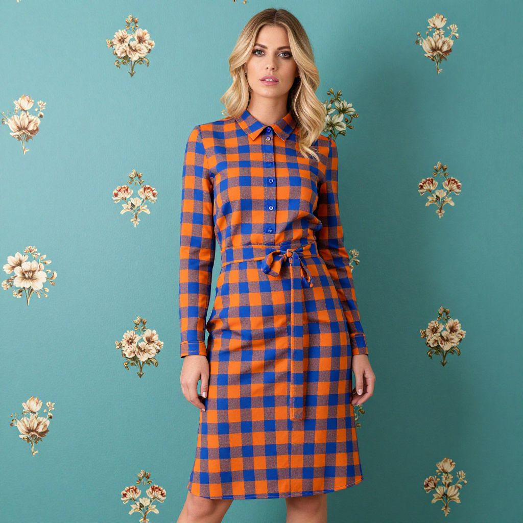 A woman models a stylish orange and blue checkered shirt dress with a front button closure and a tied waist belt, standing confidently against a teal background adorned with a vintage floral pattern. The look combines bold color blocking with classic 1970s-inspired retro style for a chic, modern appearance.