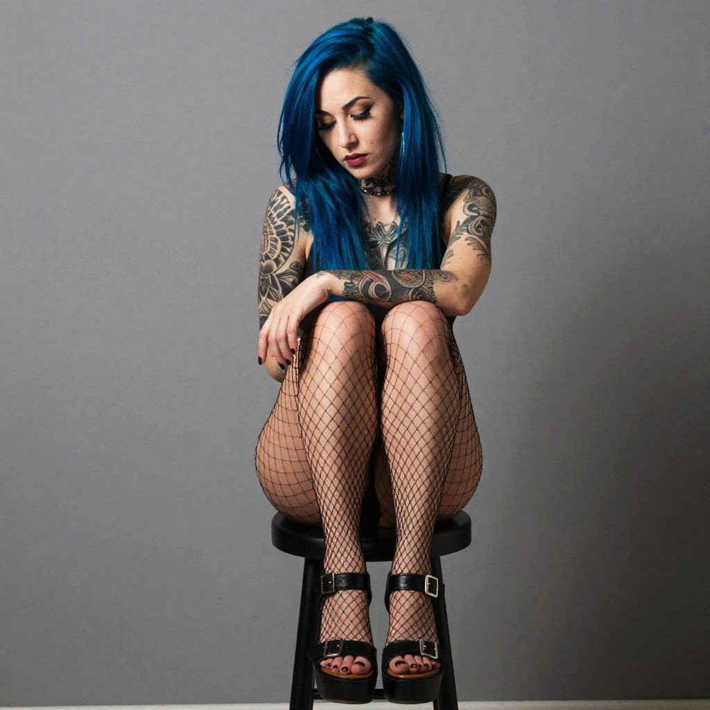 Edgy Blue-Haired Woman with Tattoos and Fishnet Stockings Sitting on Stool