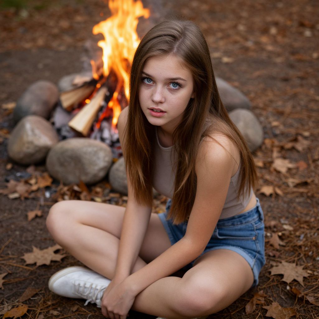 A young woman with long brown hair and blue eyes sits cross-legged on the forest floor near a campfire surrounded by large stones. She wears a sleeveless beige top, denim shorts, and white sneakers, looking directly at the camera with a contemplative expression in a natural outdoor setting.