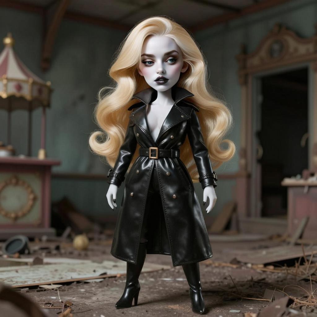 A stylized figure of a woman with long, voluminous blonde hair stands confidently in a worn, abandoned setting. She wears a sleek, black leather trench coat and matching boots, embodying a dark, gothic fashion aesthetic with a strong, mysterious vibe.
