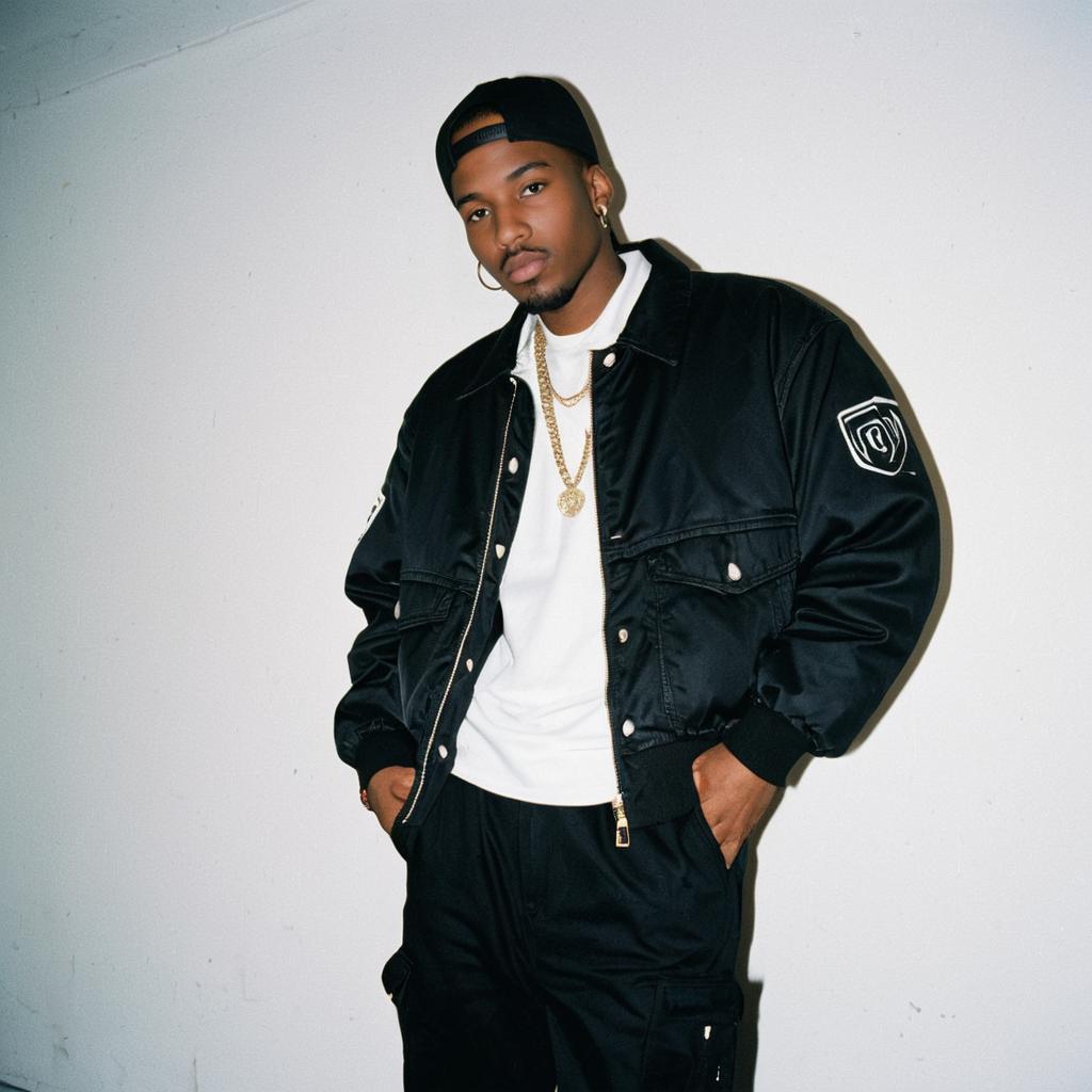 A man showcasing classic 90s hip-hop fashion poses confidently against a plain white wall. He wears a black jacket over a white shirt, accessorized with gold chains and a backward baseball cap, embodying the street style of the era.