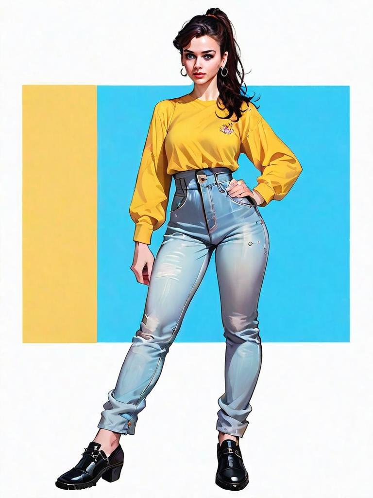 This is a realistic digital illustration of a woman standing confidently in a casual outfit, featuring a bright yellow sweater and high-waisted light blue jeans. The artwork captures detailed facial features and textures with a clean, vibrant background divided into blue and yellow geometric color blocks, highlighting the modern comic-style influence.