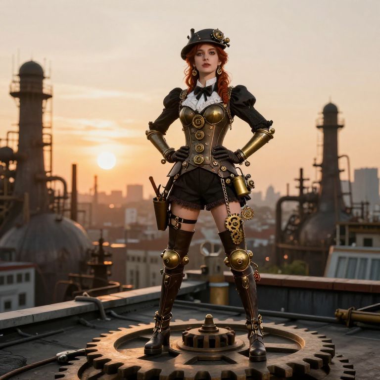 A confident woman dressed in an elaborate steampunk outfit stands on a rooftop at sunset, surrounded by industrial buildings and smokestacks. Her costume features a combination of brass and leather elements, including a corset, mechanical accessories, and gear motifs, embodying the distinctive retro-futuristic style of steampunk fashion.