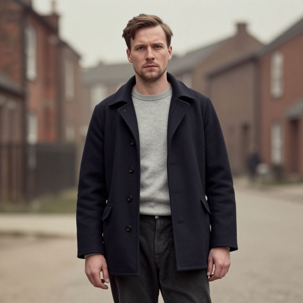 Serious Man Wearing Navy Coat and Grey Sweater Outdoors
