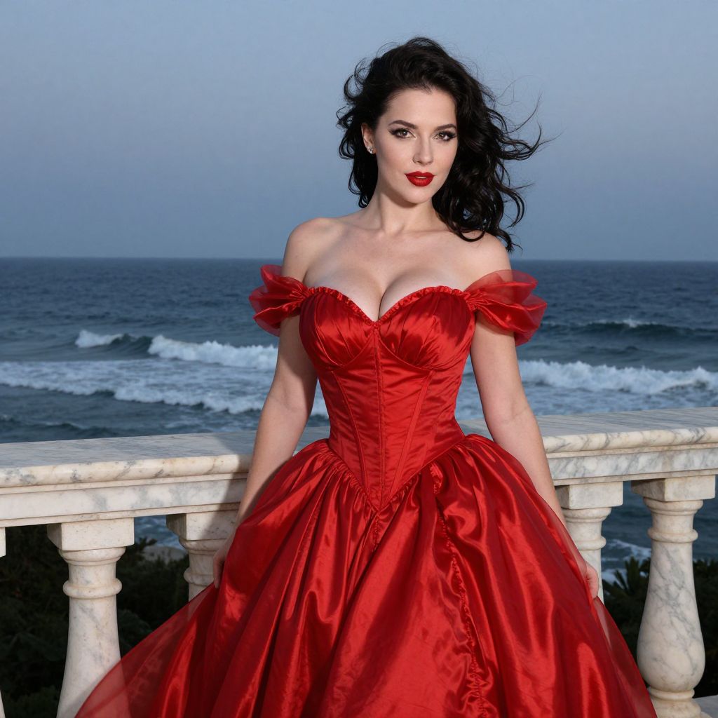 Elegant Woman in Red Satin Gown by Ocean Balcony