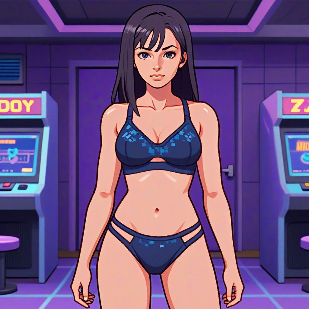A confident young woman stands in a neon-lit arcade room, wearing a futuristic dark blue lingerie set with pixel-like patterns. The vibrant, retro-inspired digital artwork captures a cyberpunk aesthetic with sharp lines and vivid colors, highlighting the character's determined expression and dynamic environment.