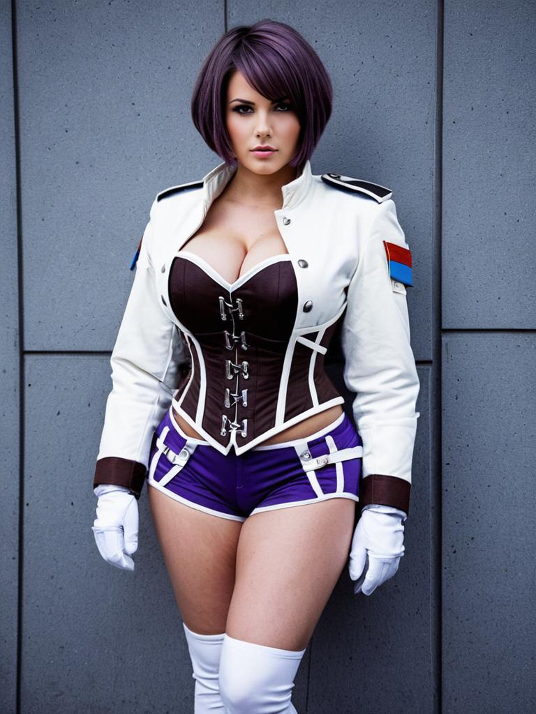 A confident woman poses in a detailed cosplay outfit inspired by fantasy or video game aesthetics, featuring a white military-style jacket with colorful patches, a brown corset, and purple shorts accented with white straps. Her vibrant purple bob hairstyle and striking makeup enhance the overall look, set against a modern concrete wall backdrop.