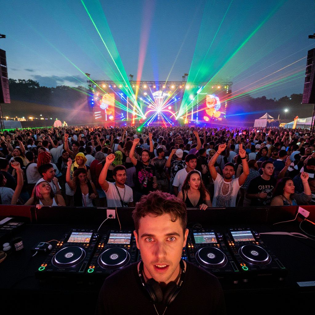 A passionate DJ performs live on stage in front of a large, energetic crowd at an outdoor music festival as colorful laser lights and vibrant stage visuals light up the twilight sky. The enthusiastic audience enjoys the dynamic atmosphere, dancing and raising their hands to the beats delivered through cutting-edge DJ equipment.
