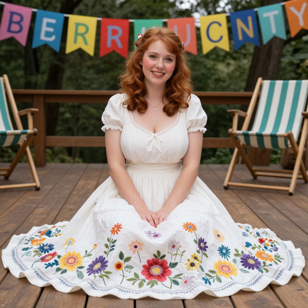 A smiling red-haired woman in a white dress adorned with colorful floral embroidery sits gracefully on a wooden deck. Behind her, vibrant multicolored pennant banners are strung, creating a cheerful and inviting outdoor atmosphere.