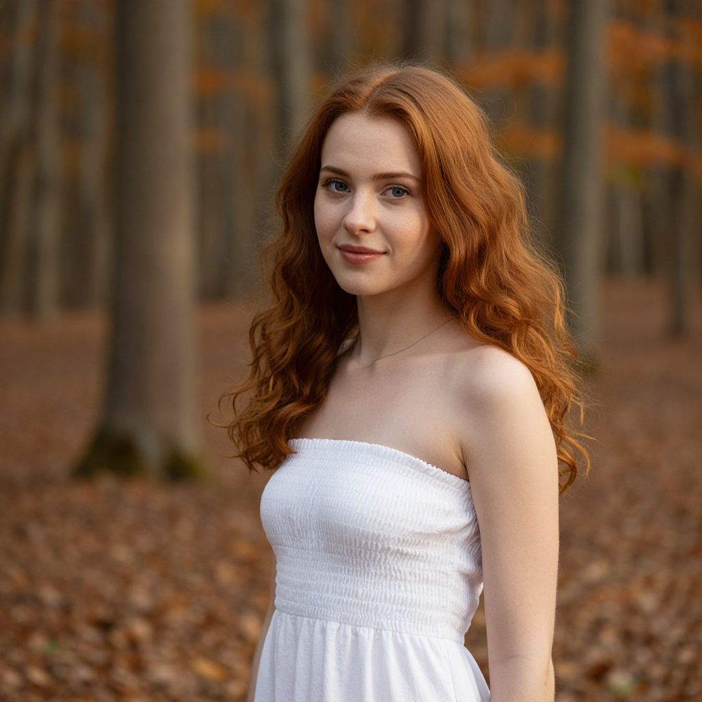 Portrait of Redheaded Woman in White Dress in Autumn Forest
