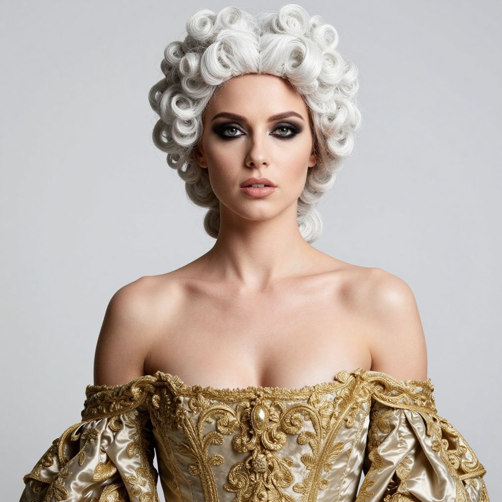 A woman dressed in an elaborate, gold embroidered baroque-style gown poses against a plain background. She wears a white, curly powdered wig reminiscent of 18th-century European aristocracy, complemented by dramatic smoky eye makeup, creating a striking historical yet modern fashion portrait.