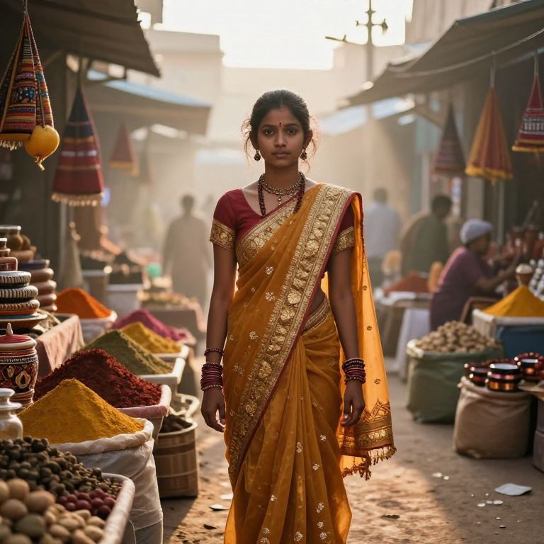 A young woman dressed in a traditional mustard-yellow saree with intricate gold embroidery walks through a vibrant Indian marketplace filled with colorful spices and pottery. The scene captures the rich cultural heritage and everyday life of the region with warm, natural lighting enhancing the earthy tones of the setting.