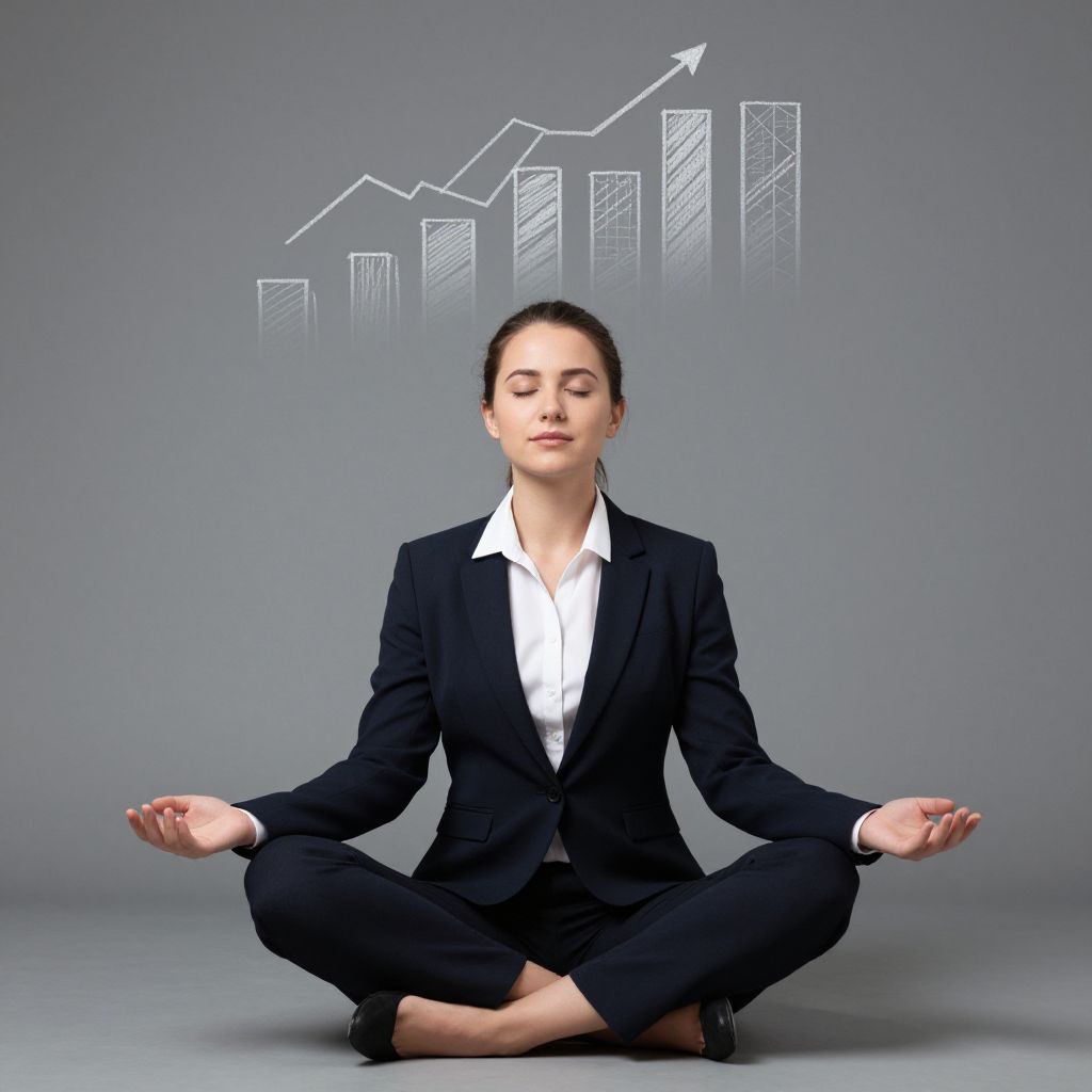 A business woman dressed in a navy suit is sitting cross-legged in a meditative yoga pose with eyes closed, symbolizing calm and focus. Above her head, a chalk-drawn graph with an upward trend arrow represents business growth and success, blending mindfulness with professional ambition.
