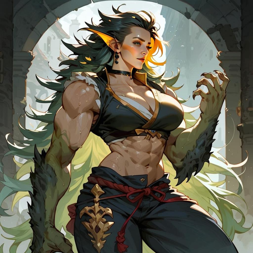 This digital fantasy artwork depicts a muscular woman with long flowing hair, sharp elven ears, and clawed hands, exuding strength and mystery. She stands confidently in a detailed medieval or ancient ruin setting, rendered in a dynamic anime-inspired style with vivid shading and intricate costume design.