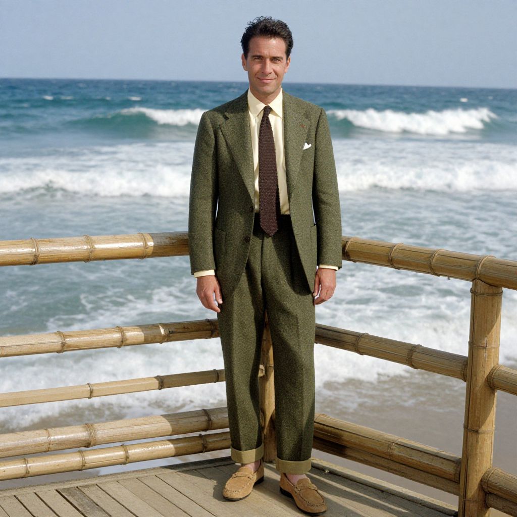 A man in a textured olive green suit stands confidently on a wooden deck by the ocean, with waves crashing in the background. He pairs the suit with a light yellow shirt, dark brown tie, and tan loafers, exuding classic formal style against a natural coastal setting.