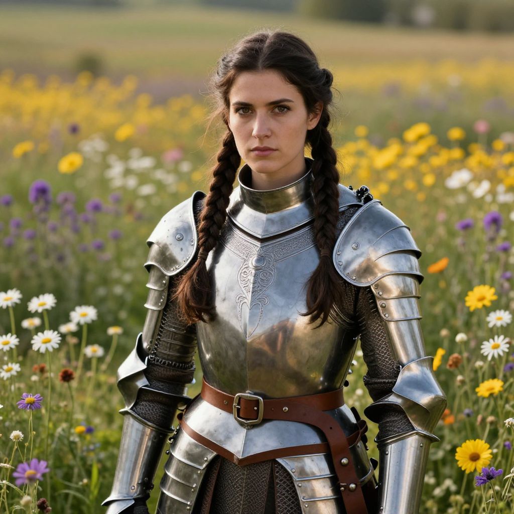 A determined woman stands confidently in a field of colorful wildflowers wearing a full set of shining medieval plate armor. Her braided hair and serious expression contrast with the bright, natural background, evoking a timeless blend of strength and serenity.