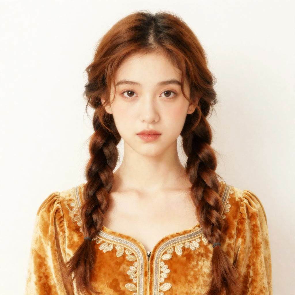 Young Woman in Vintage Mustard Velvet Dress with Braided Hair