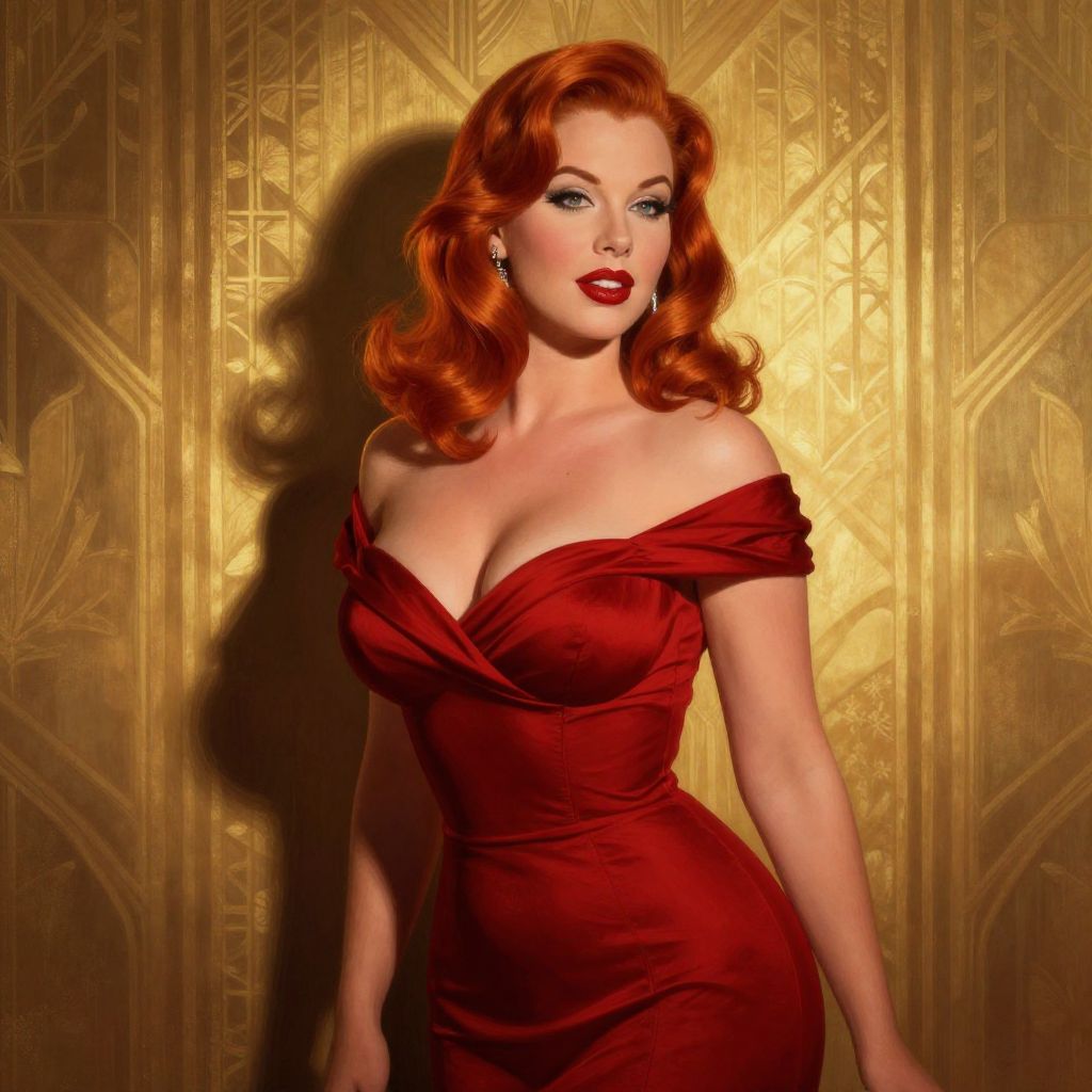 A glamorous woman with vibrant red hair styled in vintage waves poses confidently against an elegant golden art deco backdrop. She wears a striking off-shoulder red dress that accentuates her figure, embodying classic Hollywood glamour and pin-up style.