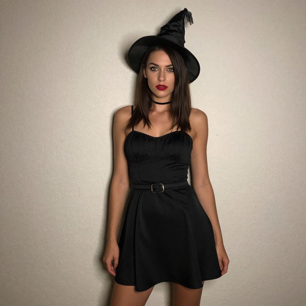 A woman stands confidently against a plain wall wearing a sleek black witch costume featuring a belted dress and a pointed witch hat. Her bold red lipstick and choker necklace complement the Halloween-themed outfit, capturing a stylish and modern take on classic witch attire.