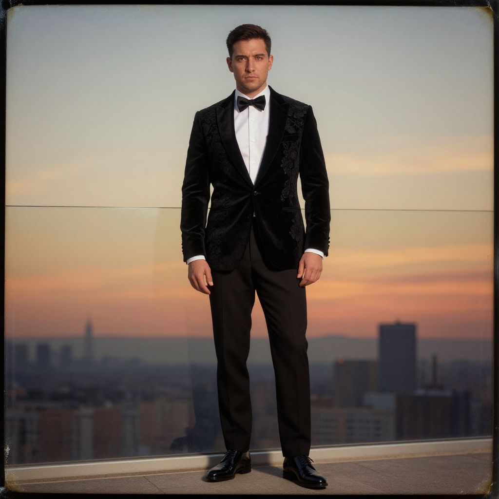 Elegant Man in Black Velvet Tuxedo on Rooftop at Sunset