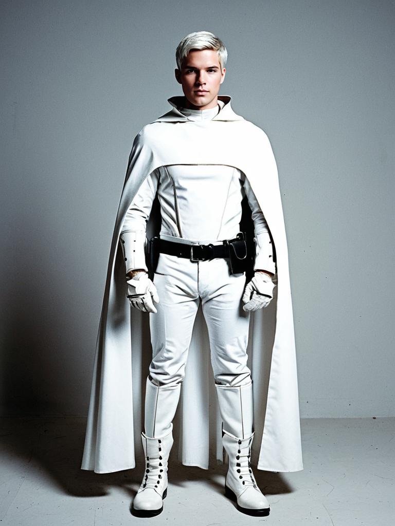 A young man stands confidently wearing a futuristic white costume that includes a long flowing cape, fitted pants, and gloves. The clean lines and monochromatic palette emphasize a modern, sci-fi inspired aesthetic.