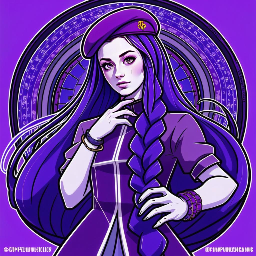 This vibrant digital illustration features a confident woman with long braided purple hair wearing a beret and stylish outfit. The artwork is rendered in a bold anime style with striking line work and a dynamic circular background filled with cryptic symbols, enhancing the mystical and modern aesthetic.