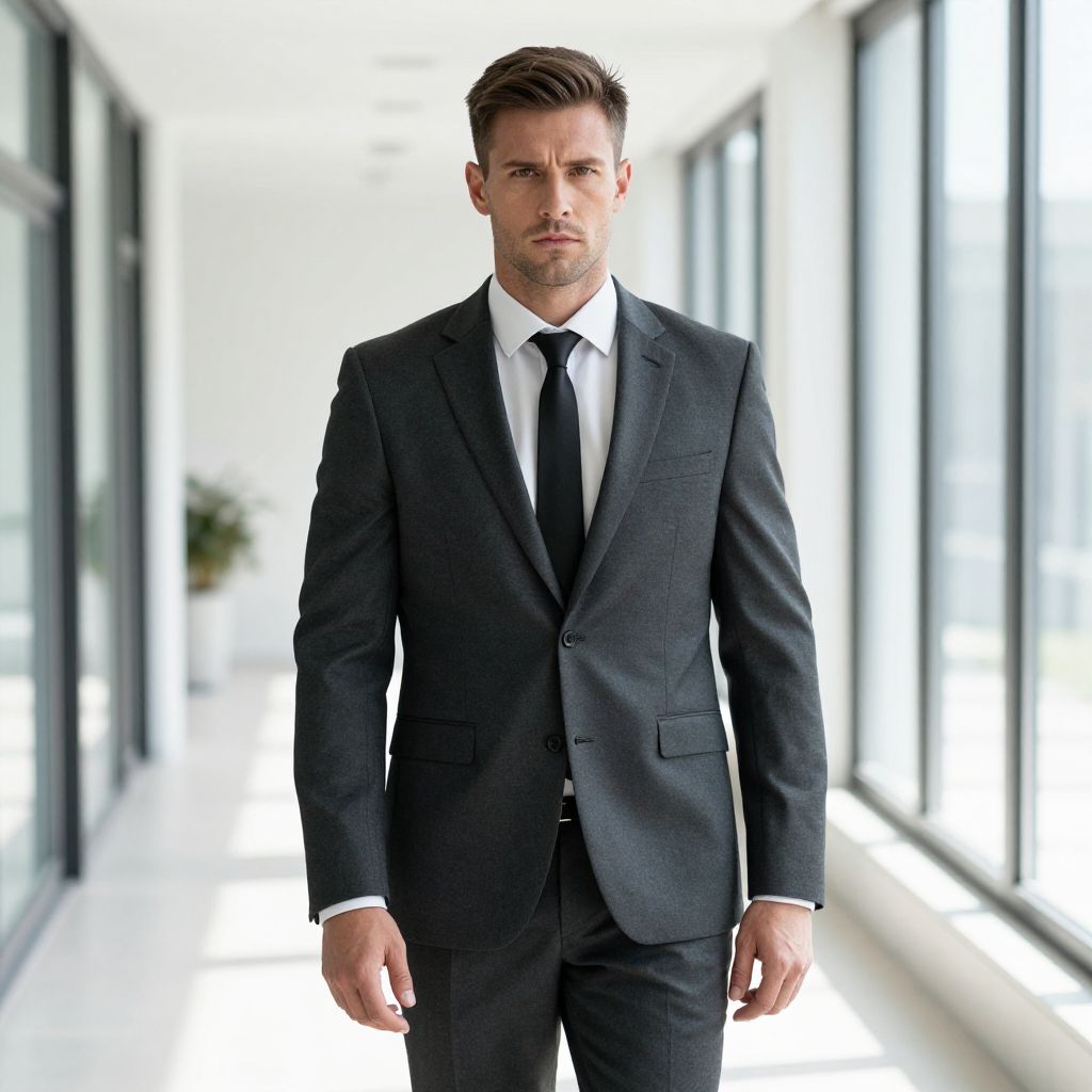 Confident Man in Dark Gray Suit Standing in Modern Office Corridor