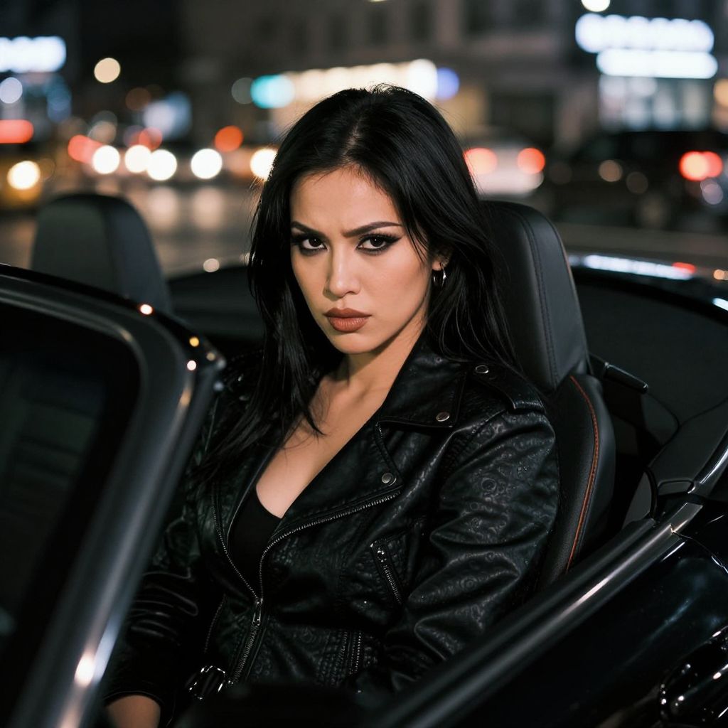 A confident woman with striking makeup and dark hair sits in a sleek convertible car at night, wearing a stylish black leather jacket. The blurred city lights in the background add a dynamic urban atmosphere to the composition.