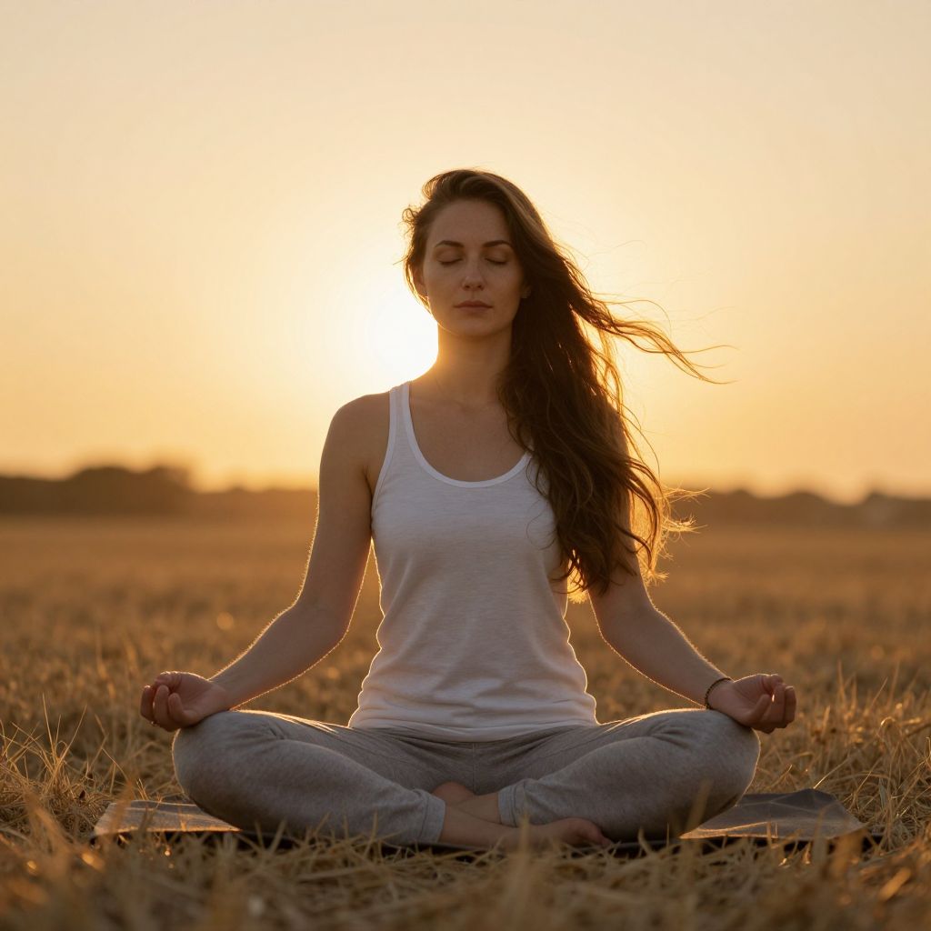 A woman is practicing meditation outdoors in a serene field during sunset, with her eyes closed and legs crossed in a classic lotus pose. The warm golden light of the setting sun highlights her calm expression and flowing hair, creating a peaceful and contemplative mood.