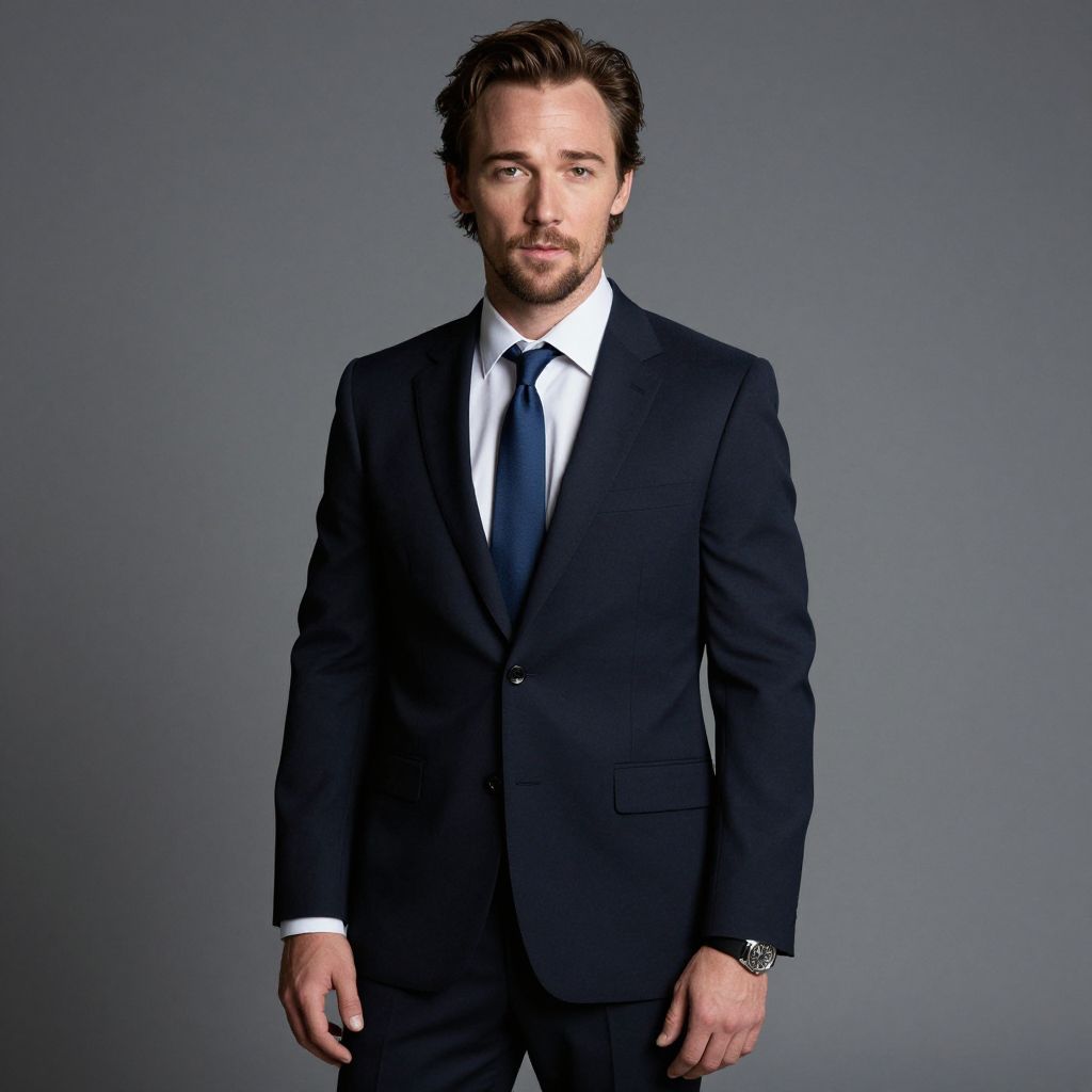 A confident man dressed in a stylish dark navy suit with a white shirt and navy tie stands against a simple grey background. The well-groomed man sports a neatly styled haircut and a wristwatch, projecting a professional and sophisticated look.