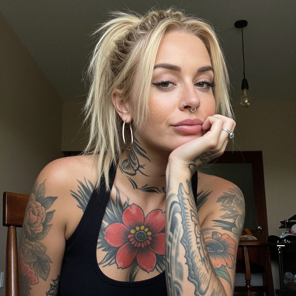 Blonde Woman with Floral Tattoos and Piercings in Casual Indoor Portrait