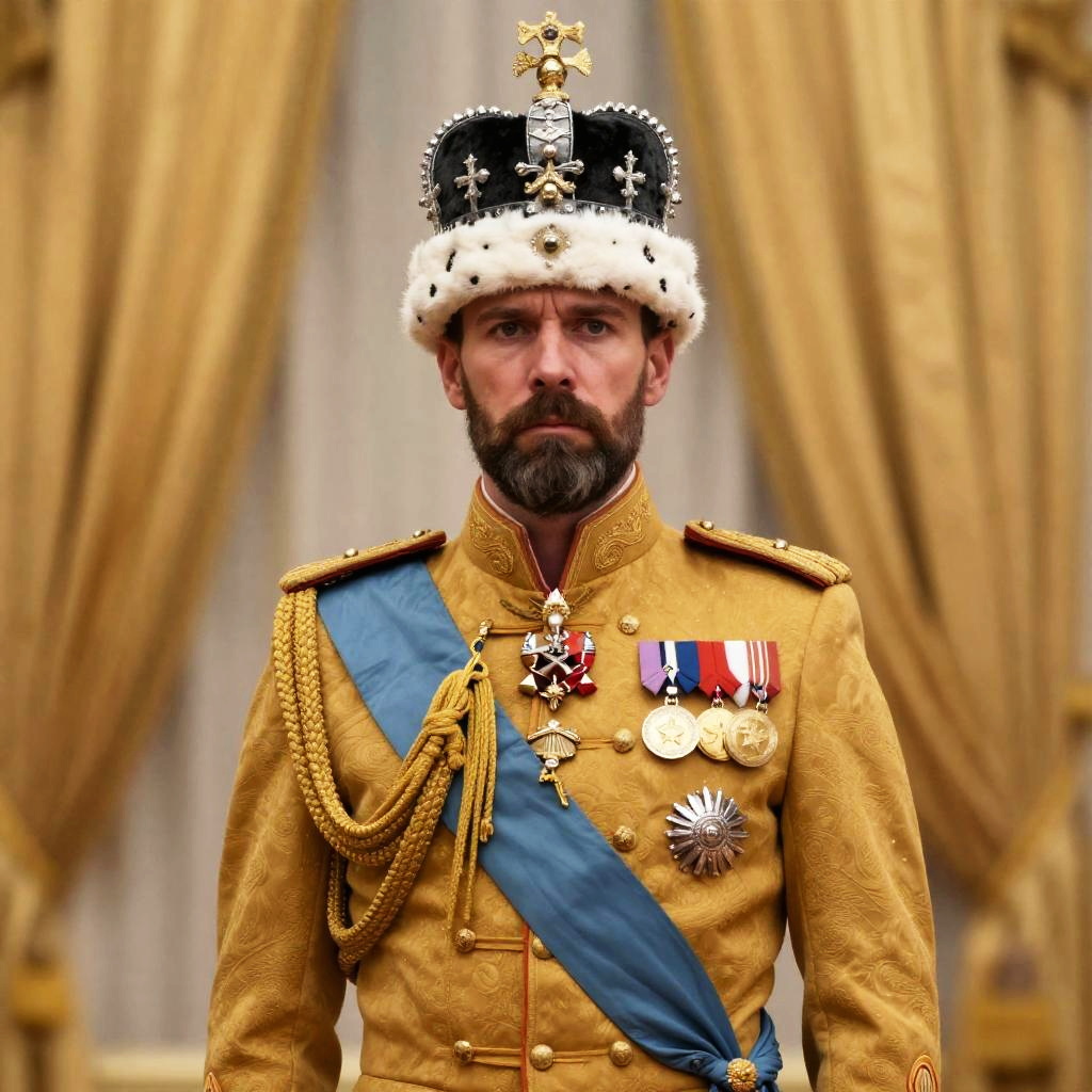 A stern man dressed in an ornate golden military uniform adorned with medals, a blue sash, and intricate gold braids stands confidently. He wears a lavish black and white fur-trimmed royal crown, set against a rich, golden draped background that emphasizes his regal presence.