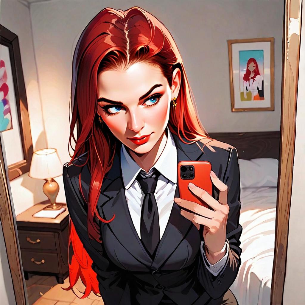 A confident red-haired woman in a sharp black suit and tie takes a selfie with a red smartphone in a warmly lit bedroom. The stylized digital artwork features bold colors and detailed shading, emphasizing her striking blue eyes and vibrant hair, while a framed portrait of a similar figure is visible on the wall behind her.