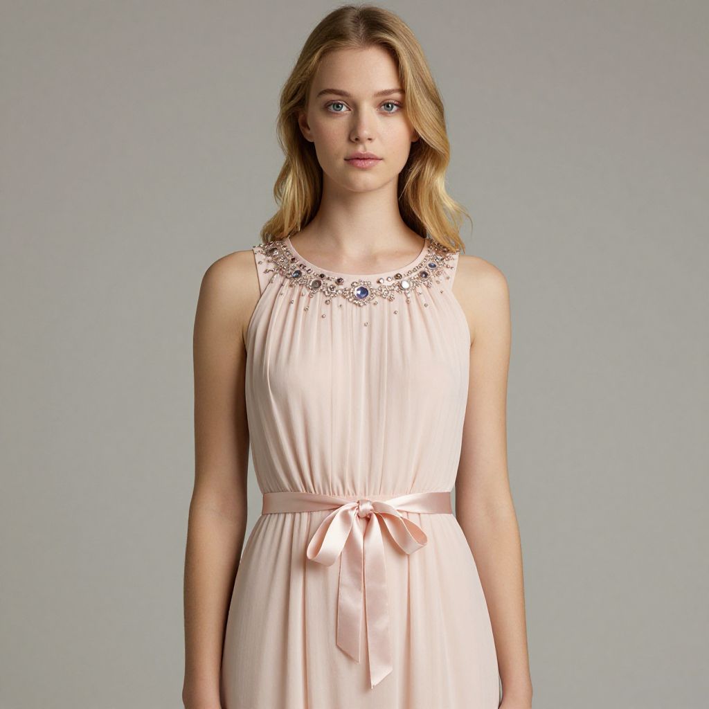 A young woman stands gracefully wearing a soft pink sleeveless dress adorned with detailed beadwork around the neckline. The dress is cinched at the waist with a matching satin ribbon, creating a refined and elegant silhouette against a neutral gray background.