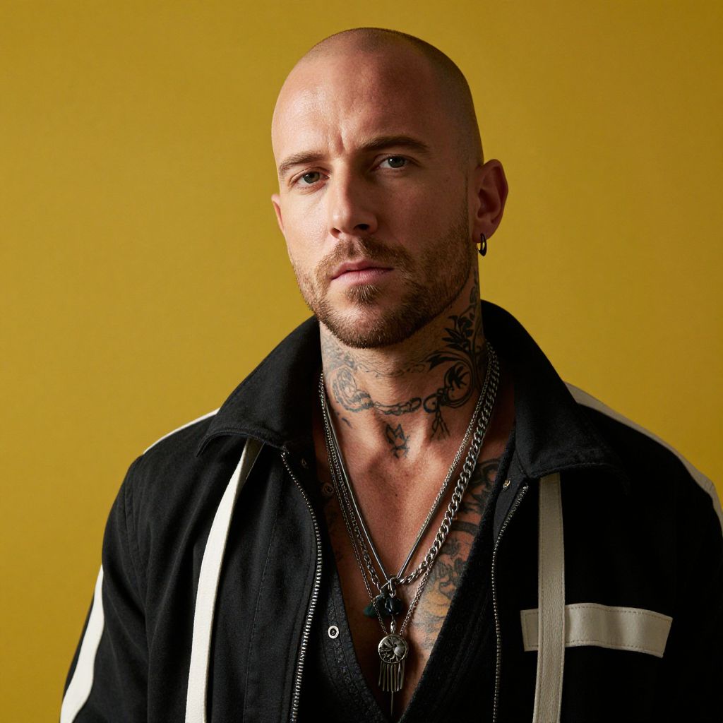 A confident bald man with a well-groomed beard and neck tattoos poses against a solid mustard yellow background. He is dressed in a black jacket with white accents and layered silver necklaces, giving off a bold and edgy style.