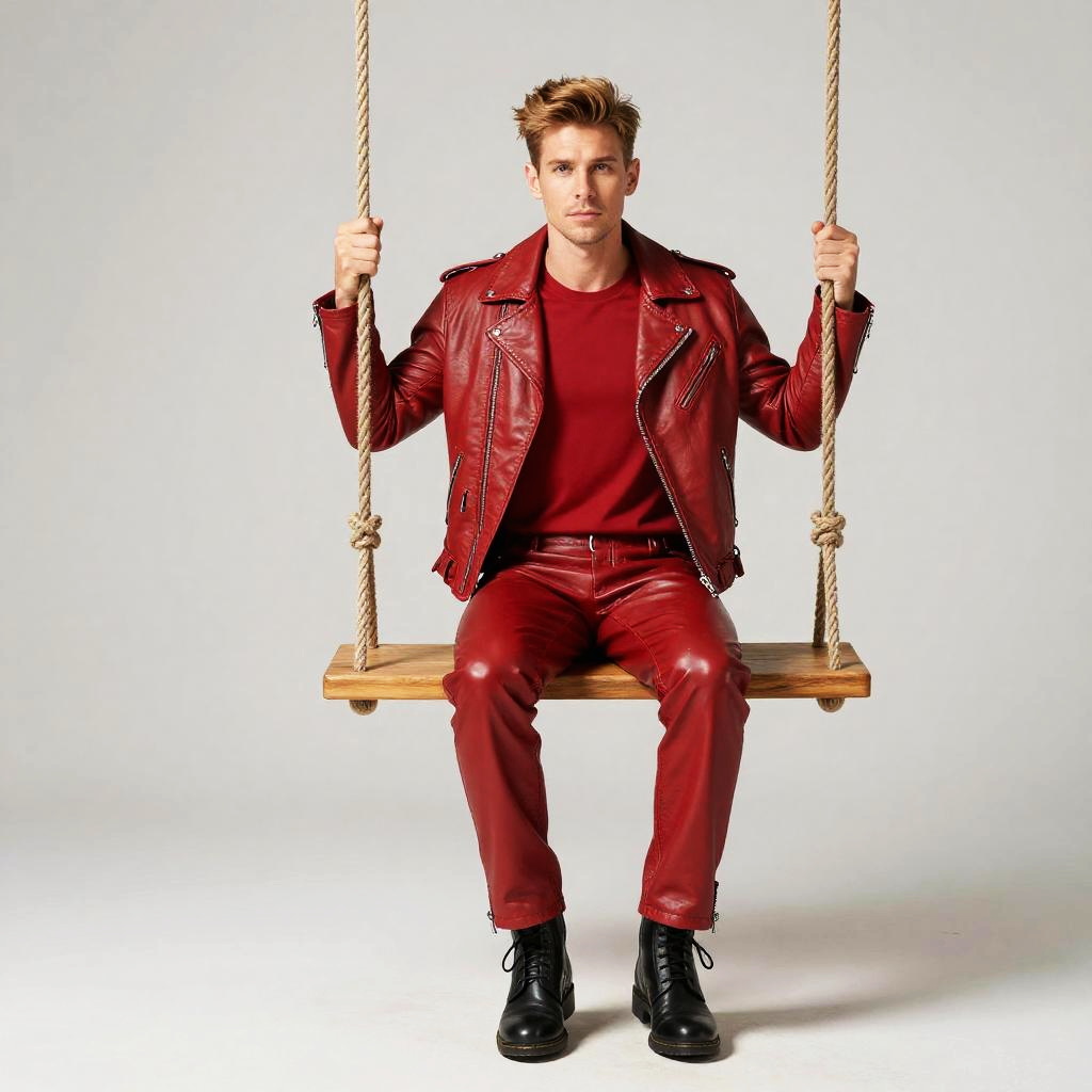 A man is seated on a wooden swing holding onto its thick ropes, styled in a striking red leather jacket and matching leather pants, paired with black boots. The minimalist background and bold outfit reflect a modern, edgy fashion statement.