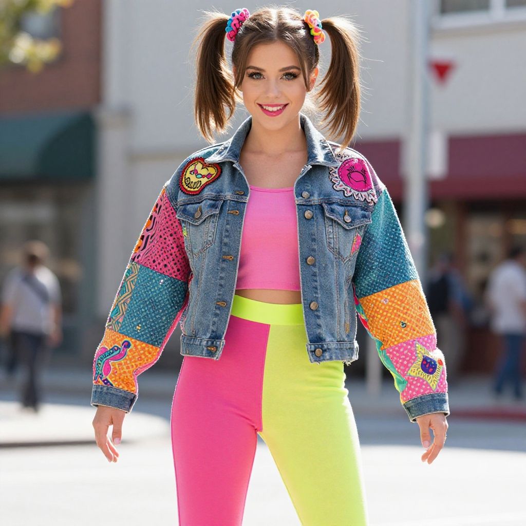 A cheerful young woman sports a colorful outfit featuring a patchwork denim jacket and vibrant neon pink and yellow leggings. Her playful look is completed with twin pigtails accessorized with bright scrunchies, capturing a fun, youthful street style vibe.