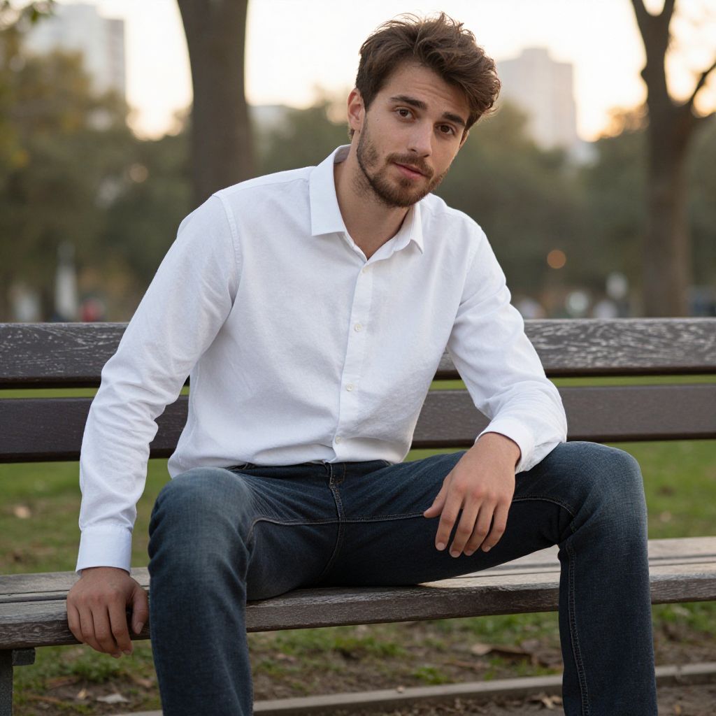 Casual Young Man Sitting on Bench Outdoors in White Shirt