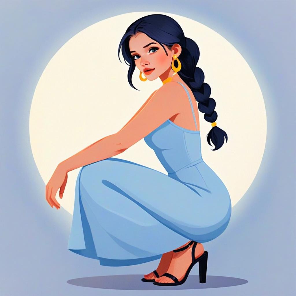 This digital illustration features a stylish young woman with dark braided hair, wearing a flowing light blue dress and black high-heeled sandals. Set against a soft circular light background, the image showcases a contemporary, clean vector art style emphasizing smooth lines and vibrant yet subtle color contrasts.