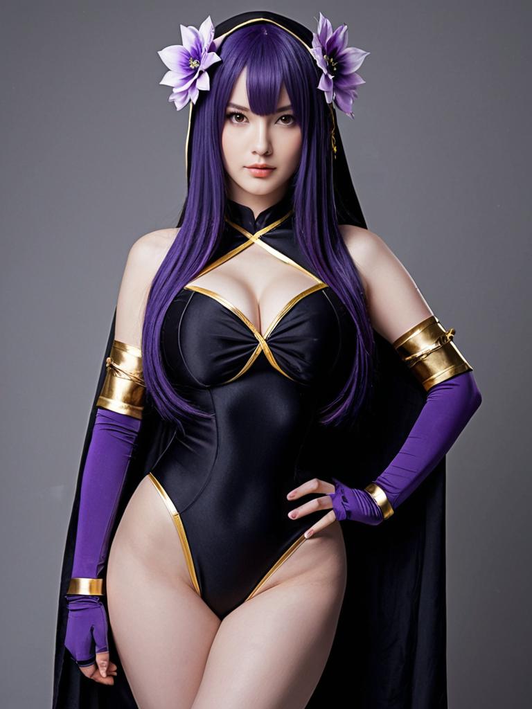 A woman poses confidently in a detailed cosplay outfit inspired by Murasaki Shikibu from the Fate series, featuring a sleek black and gold swimsuit accented with long purple gloves and matching floral hair accessories. The image showcases high-quality, realistic photography with a clean, neutral background, emphasizing the character's elegant and powerful aesthetic in a modern rendition.