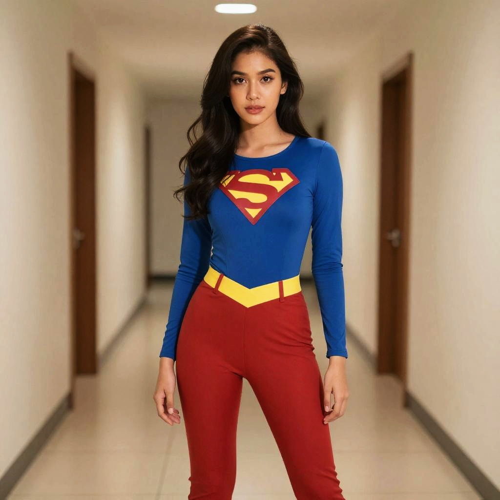 A confident woman dressed in a Pinoy superhero costume inspired by the classic Superman design stands in a well-lit hallway. She wears a royal blue top with the iconic red and yellow 'S' emblem, paired with red pants and a yellow belt, embodying a modern and stylish superhero look.