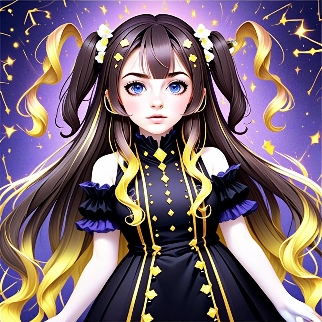 This vibrant anime-style illustration features a young woman with striking blue eyes and long, flowing black hair accented with golden yellow curls. The character is adorned in an elegant black dress with yellow embellishments, set against a sparkling purple background filled with star-like details, creating a magical and dynamic visual impact.